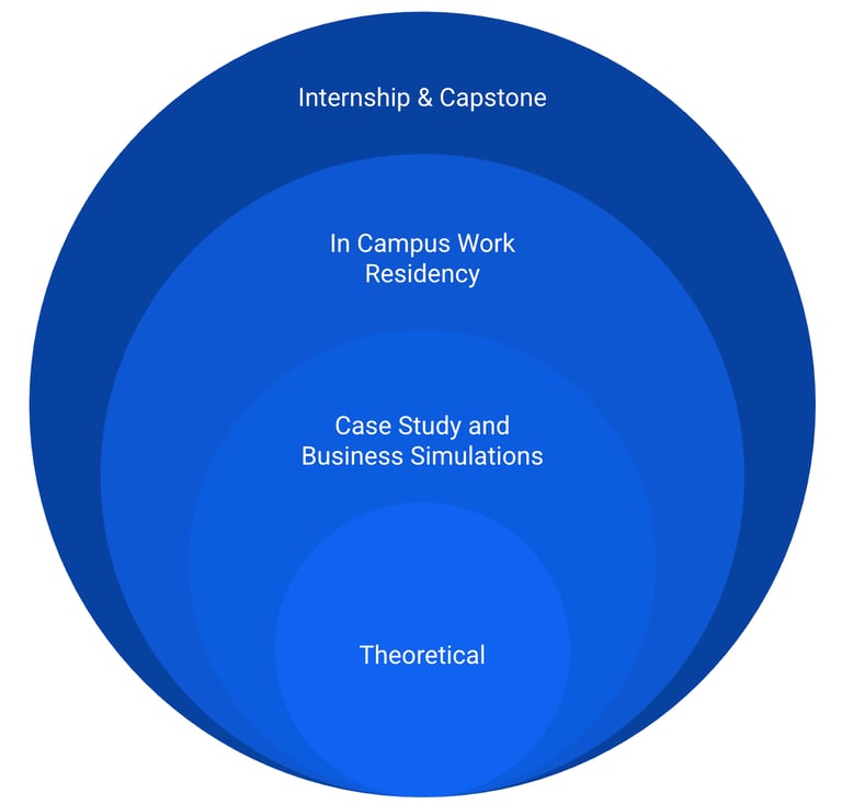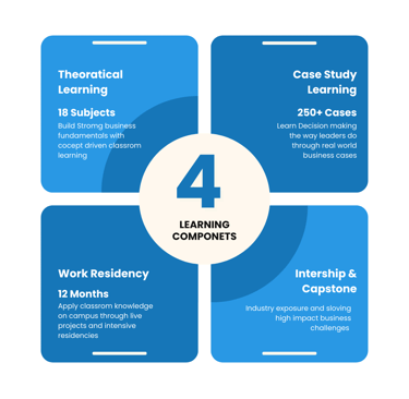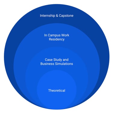 Theoretical foundations → Case-based discussions → Business simulations → Residency work program (Management Trainee) → Internship → Capstone project, ensuring students graduate industry-ready.